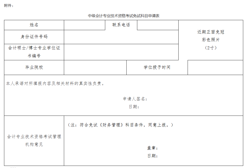 (一)《中级会计专业技术资格考试免试科目申请表》(详见附件,并附2寸近期正面免冠彩色照片,一式两份);
